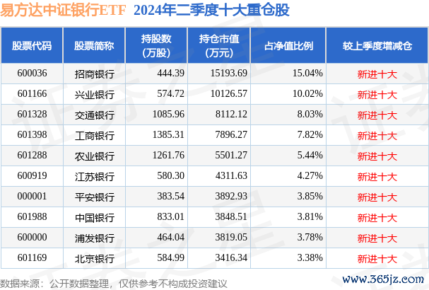 易方达中证银行ETF为指数型-股票基金,左证最新一期基金季报露馅,该基金财富设立:股票占净值比99.59%,无债券类财富,现款占净值比0.66%。基金十大重仓股如下: