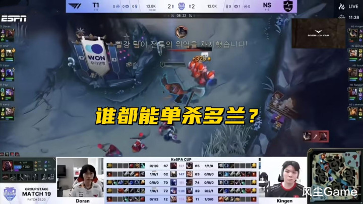 C组T1和NS的比赛,是K杯小组赛,为数未几值得一看的比赛,这场BO1学弟差点就赢了,前期NS大上风开局,多兰老司机被Kingen对位单杀,比赛才进行到10分钟,两队东谈主头比,就来到了2:7,农心大幅度逾越T1,但NS的东谈主头分派有点问题,主要麇集在朝辅身上,这亦然T1翻盘伏笔。